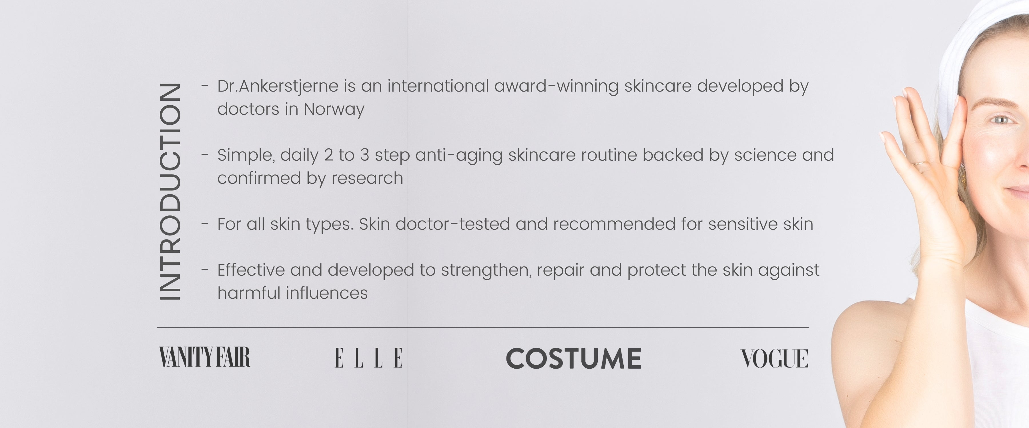 Stine Ankerstjerne, doctor and founder of Dr. Ankerstjerne, has sensitive skin. Stine's own experiences and problems with finding suitable skin care products were the start of the entrepreneurial adventure. Our products are effective without being aggressive, so they are suitable for all skin types, including sensitive skin.